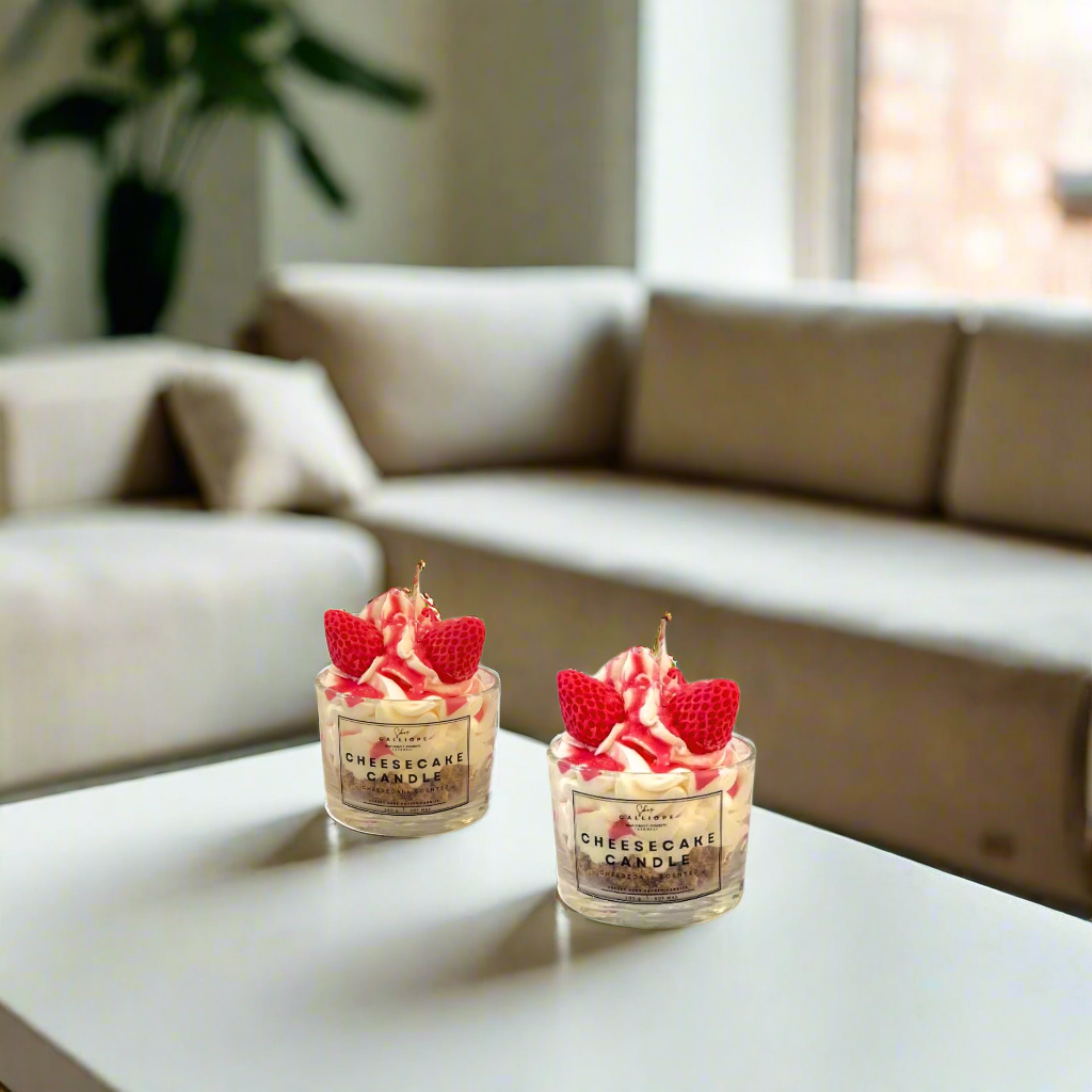 Χειροποίητο κερί σόγιας, με λαχταριστό άρωμα cheesecake, διακοσμημένο με φράουλες. Το κάθε κομμάτι είναι μοναδικό, φτιαγμένο στο χέρι, με λεπτομέρειες που θυμίζουν φρέσκια τούρτα.